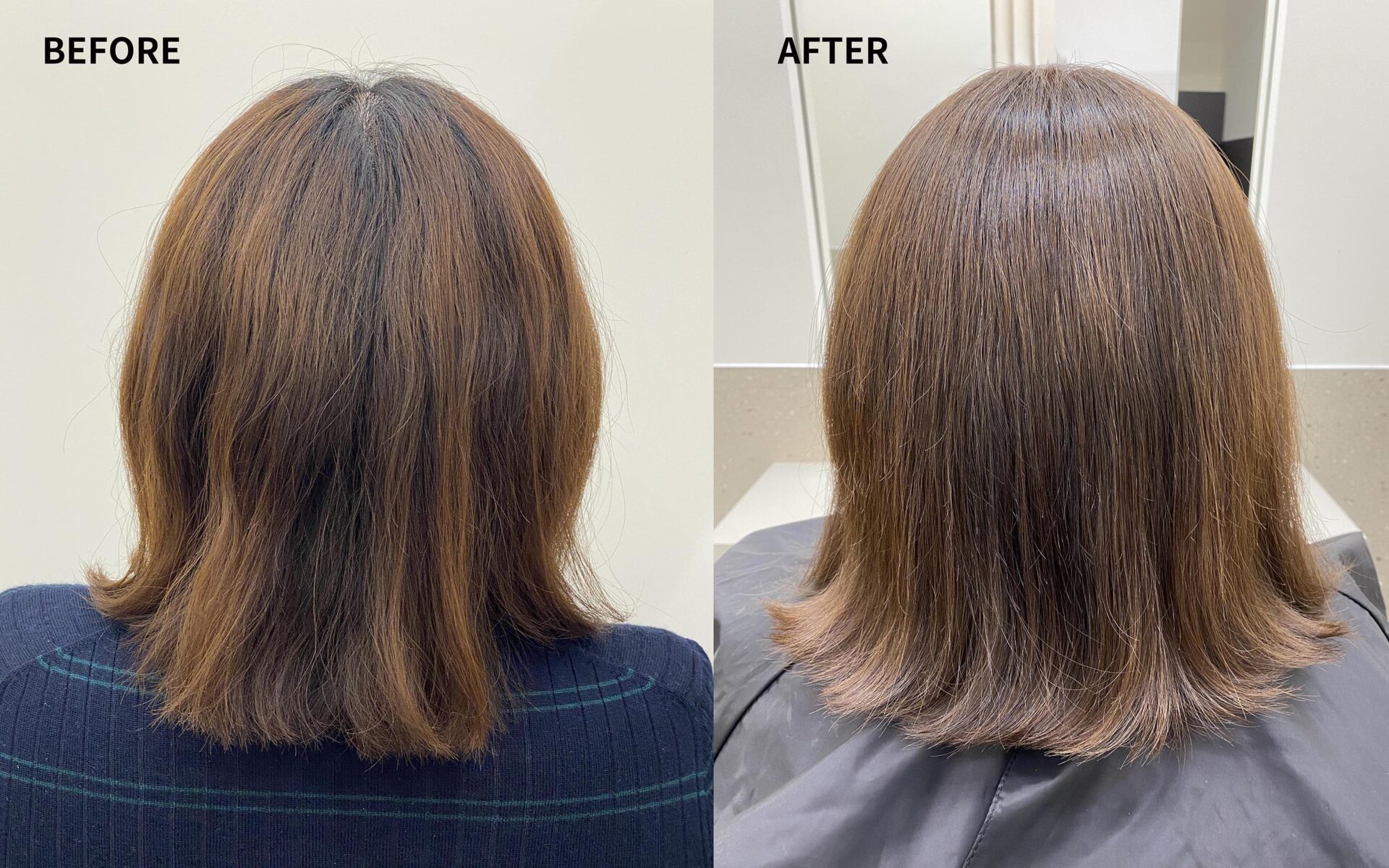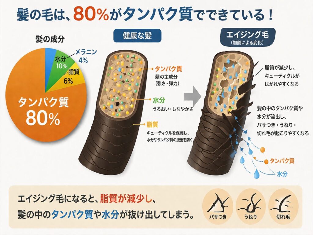 抜け出したタンパク質を補いヘアカラーの薬剤と同時に髪の内部に入れ込むことでカラーをする度に髪が強化されふかふかしたエイジング毛も改善されていきます